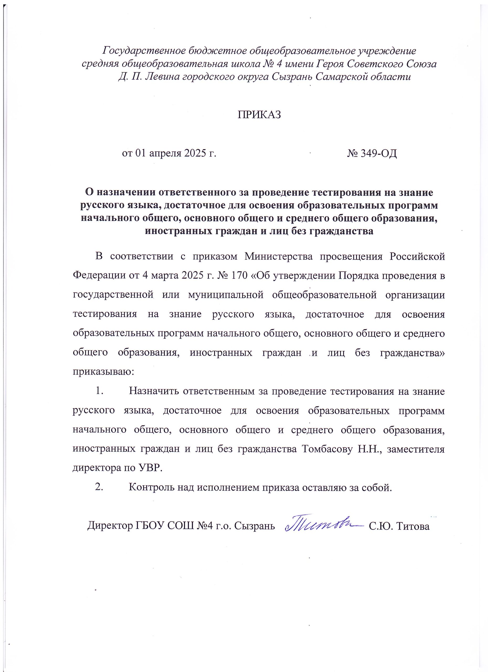 Приказ ГБОУ СОШ №4 г.о. Сызрань от 01.04.2025 № 349 «О назначении ответственного за проведение тестирования на знание русского языка, достаточное для освоения образовательных программ начального общего, основного общего и среднего общего образования, иностранных граждан и лиц без гражданства»